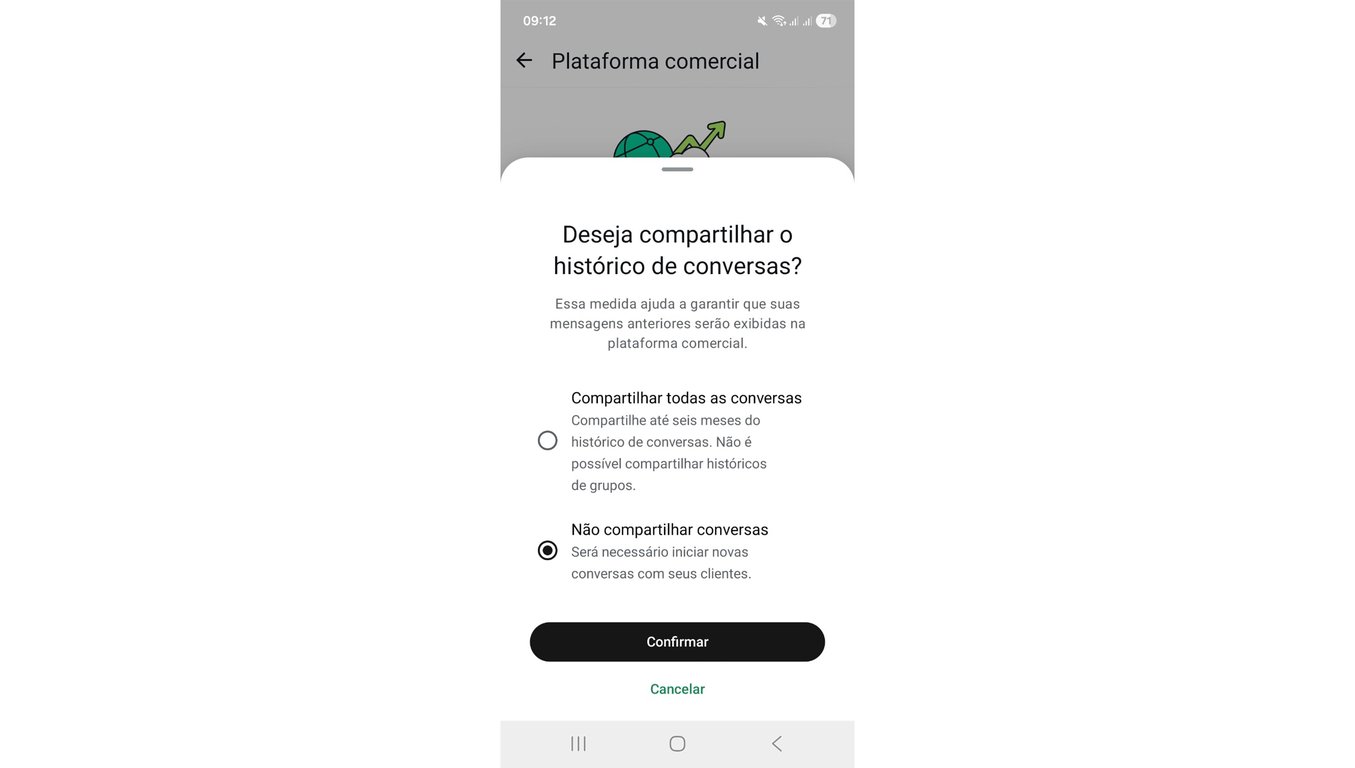 10) Nesta tela, você pode clicar em "Não compartilhar conversas" e continuar clicando em "Confirmar".