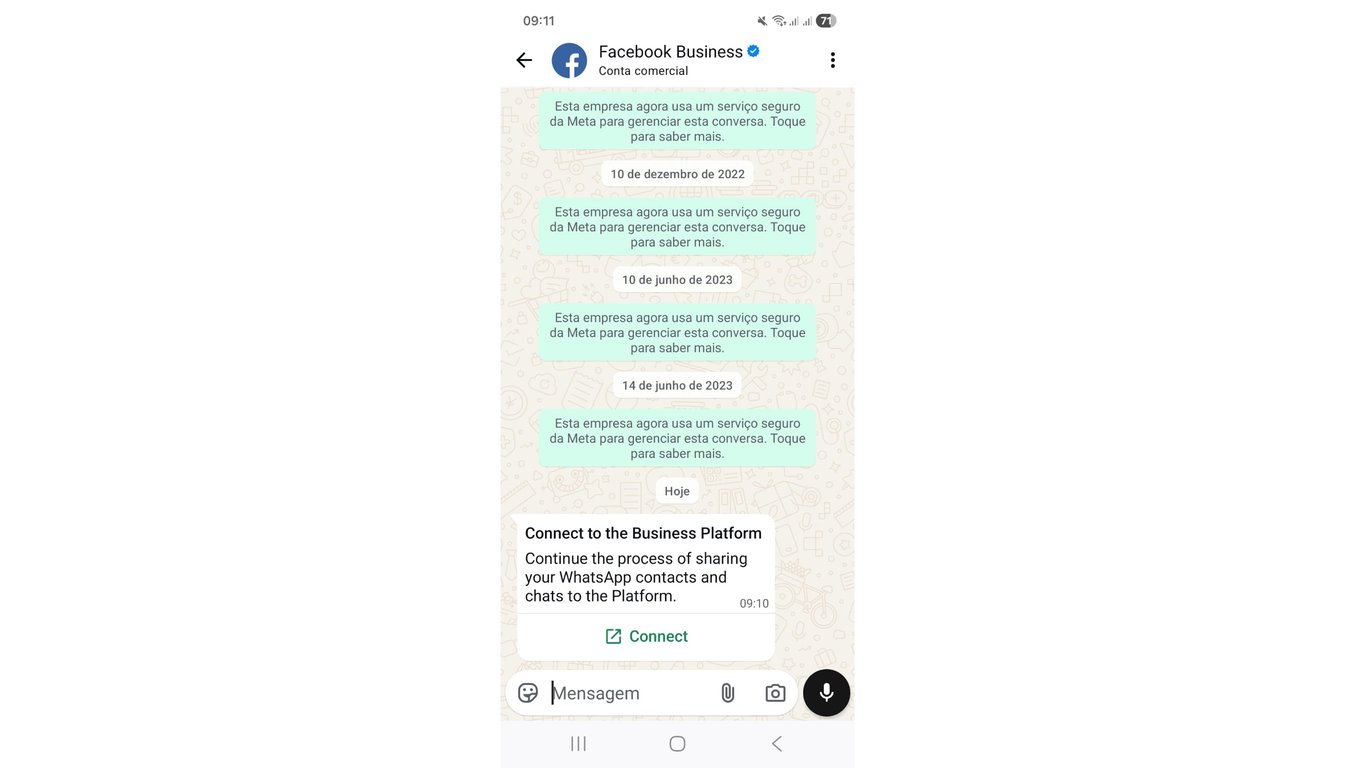 8) Você receberá uma mensagem no WhatsApp da conta oficial do "Facebook Business". Na mensagem, clique em "Conectar".
