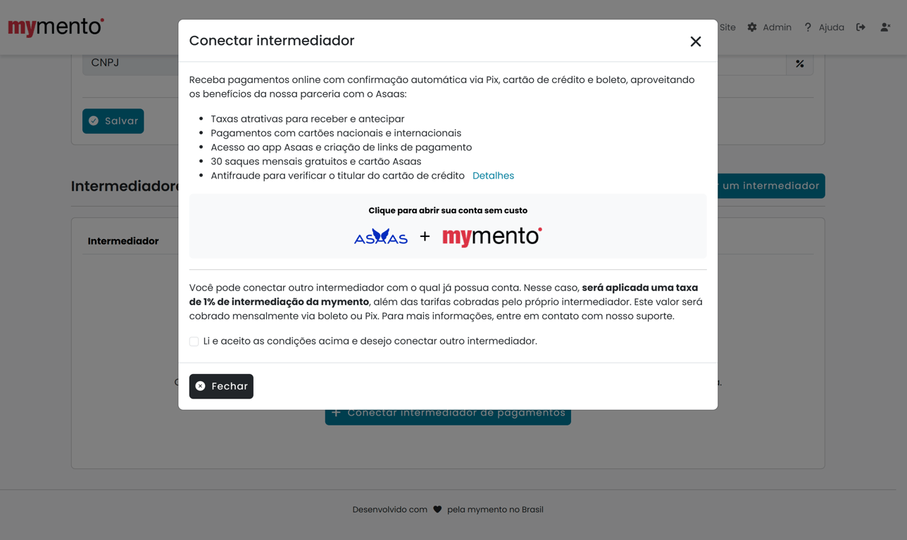 O Asaas é o intermediador parceiro da mymento, com integração direta e benefícios exclusivos para nossos clientes. Você pode criar sua conta gratuitamente e começar a receber pagamentos com Pix automático e cartão de crédito de forma rápida, sem custo de abertura.