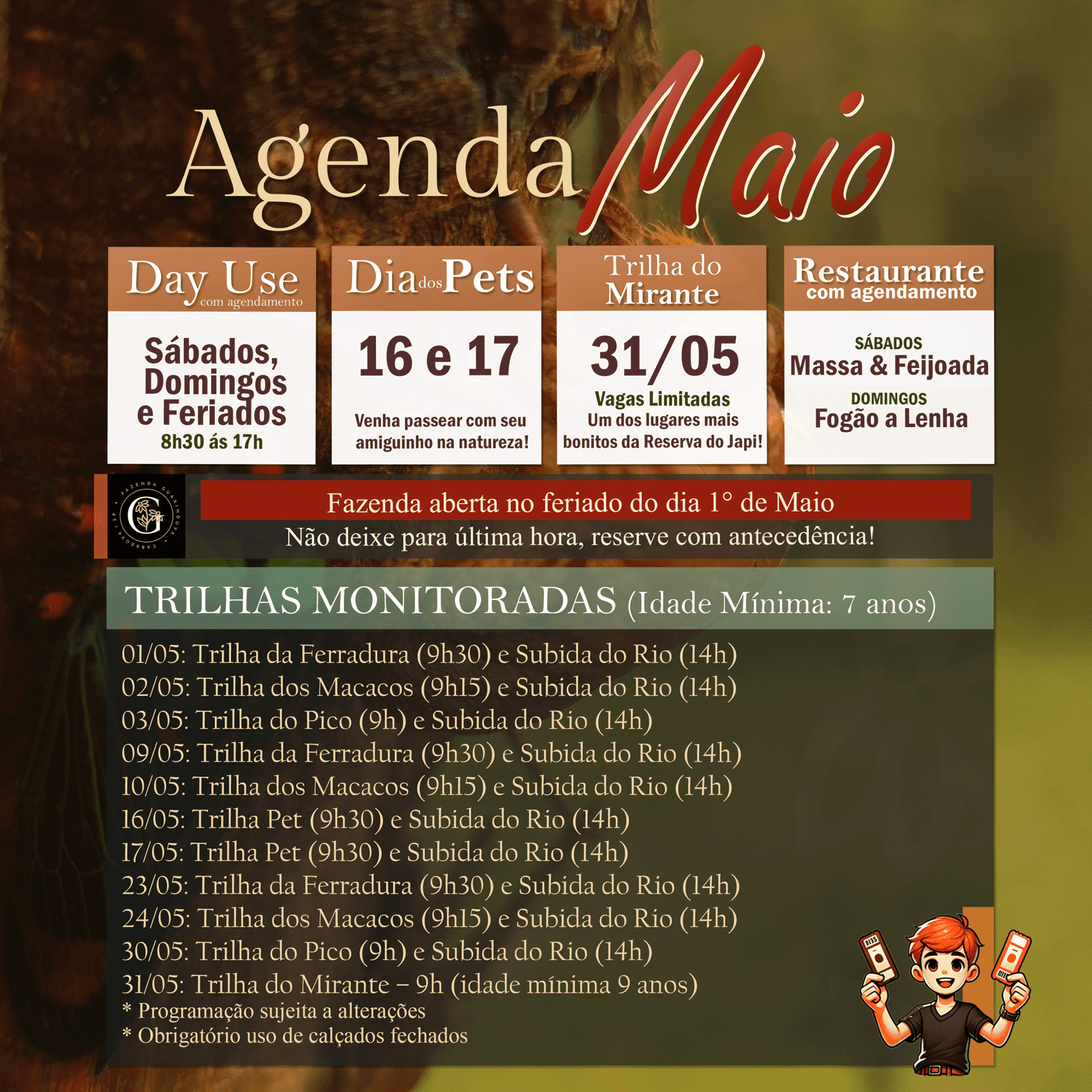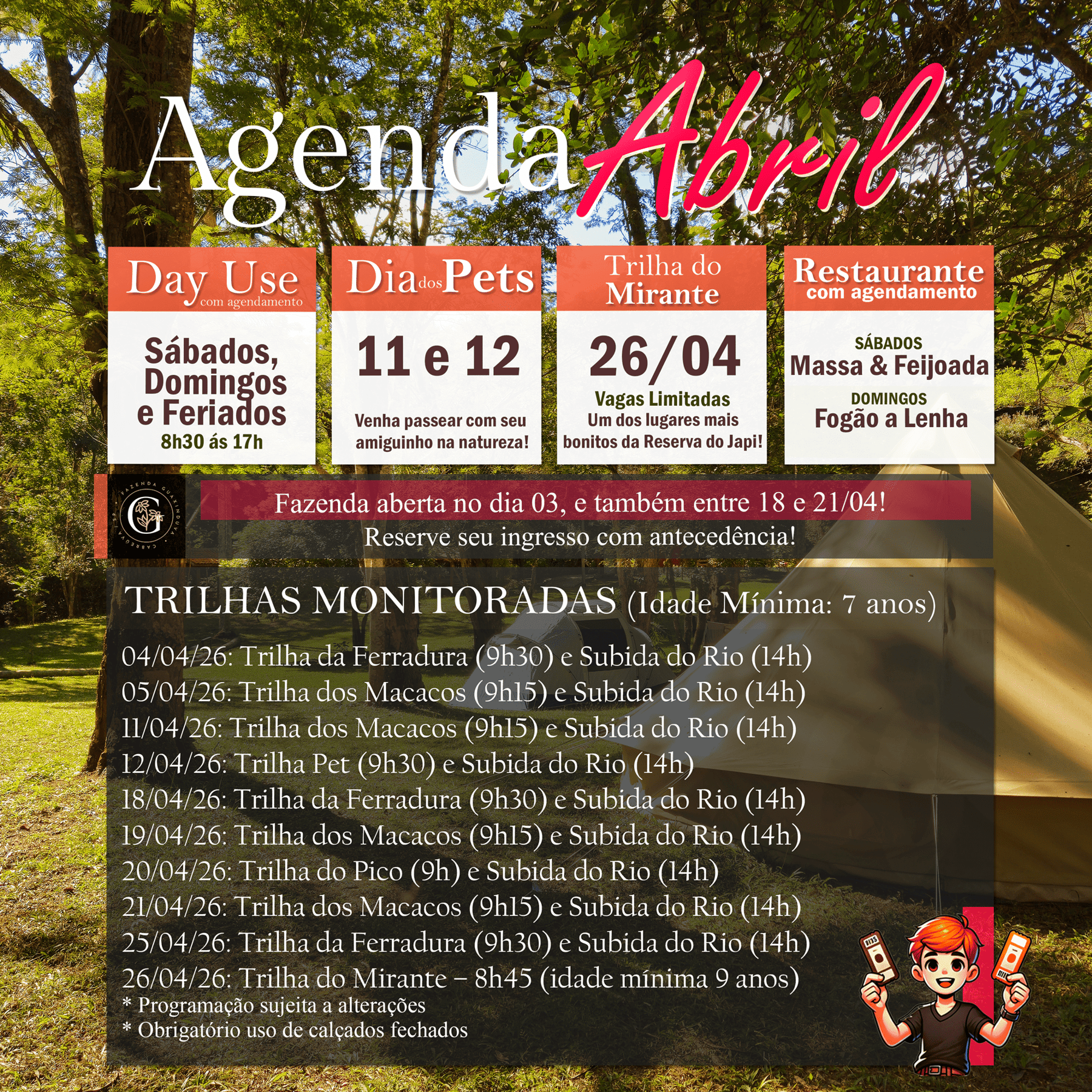 Confira a agenda do mês e escolha a melhor data para curtir um dia especial na fazenda. Para garantir sua experiência, recomendamos o agendamento antecipado, pois as vagas são limitadas.