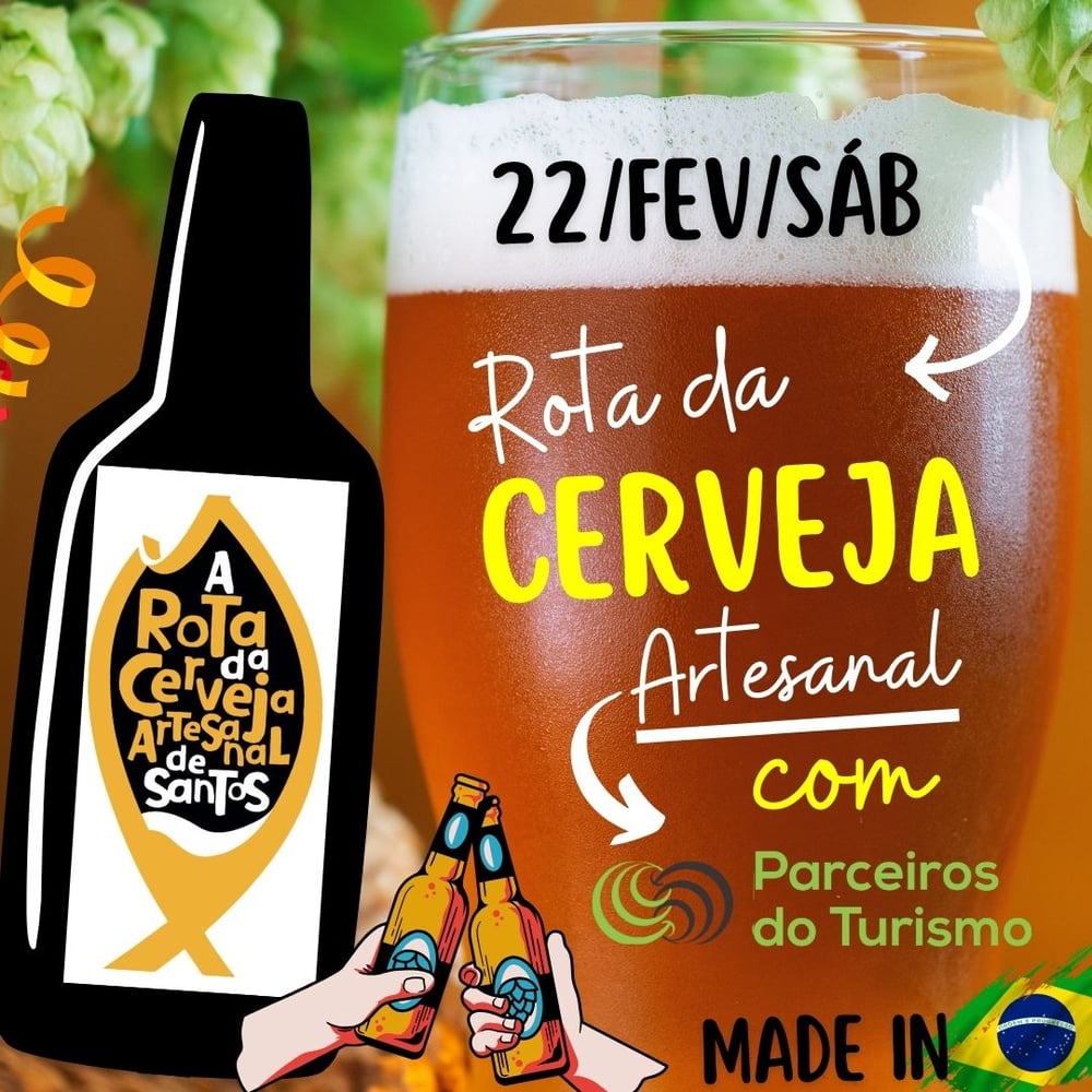 Arte de divulgação Rota da Cerveja Artesanal de Santos - roteiro regular para a formação de grupos Cervejaria Jurássica Cervejaria Everbrew Cervejaria Santista Taça da Rota da Cerveja de Santos Cervejaria Filomena Guia de Turismo Diogo